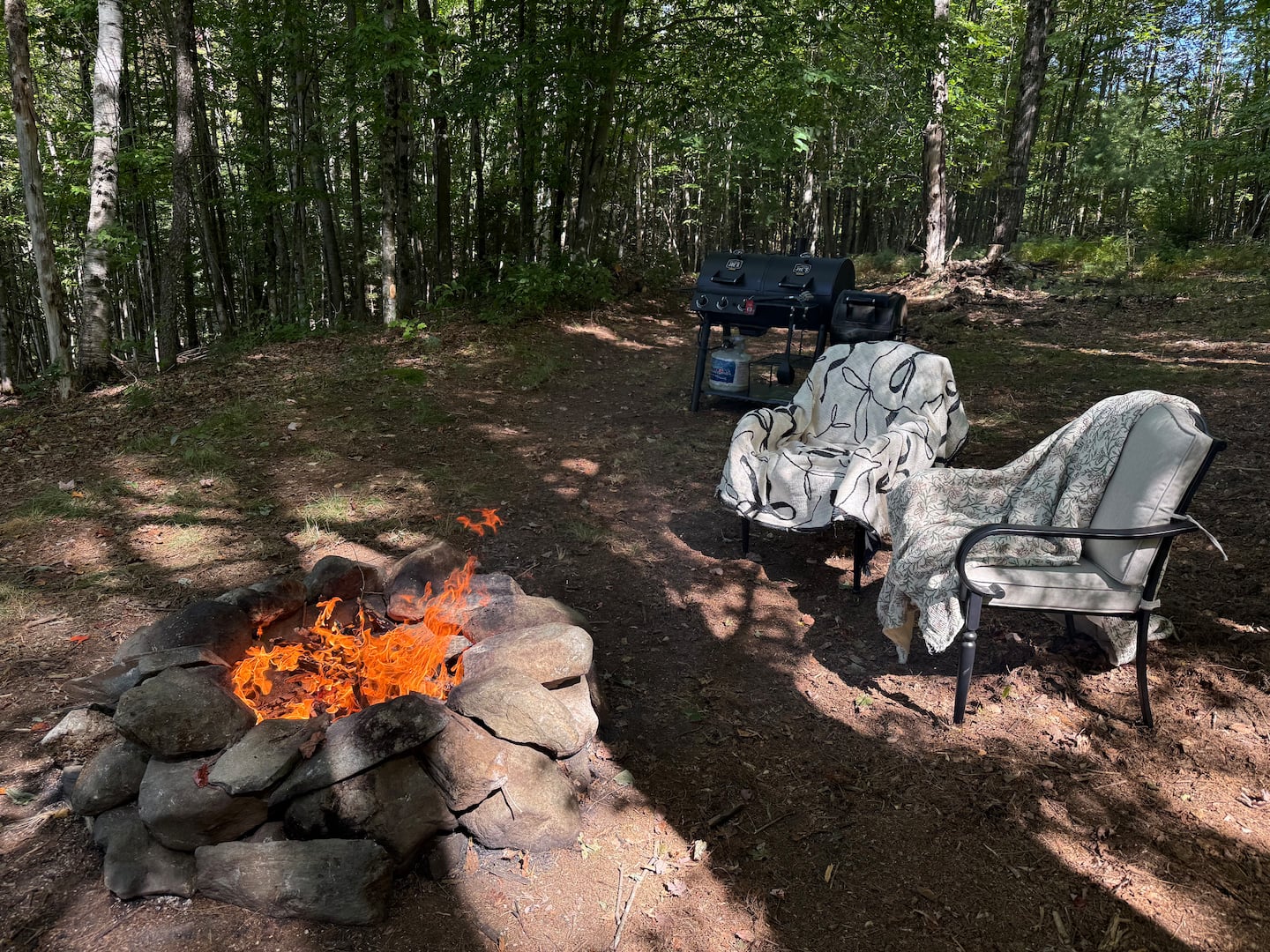 Enjoy cozy nights around the fire with Adirondack chairs and peaceful forest ambience.